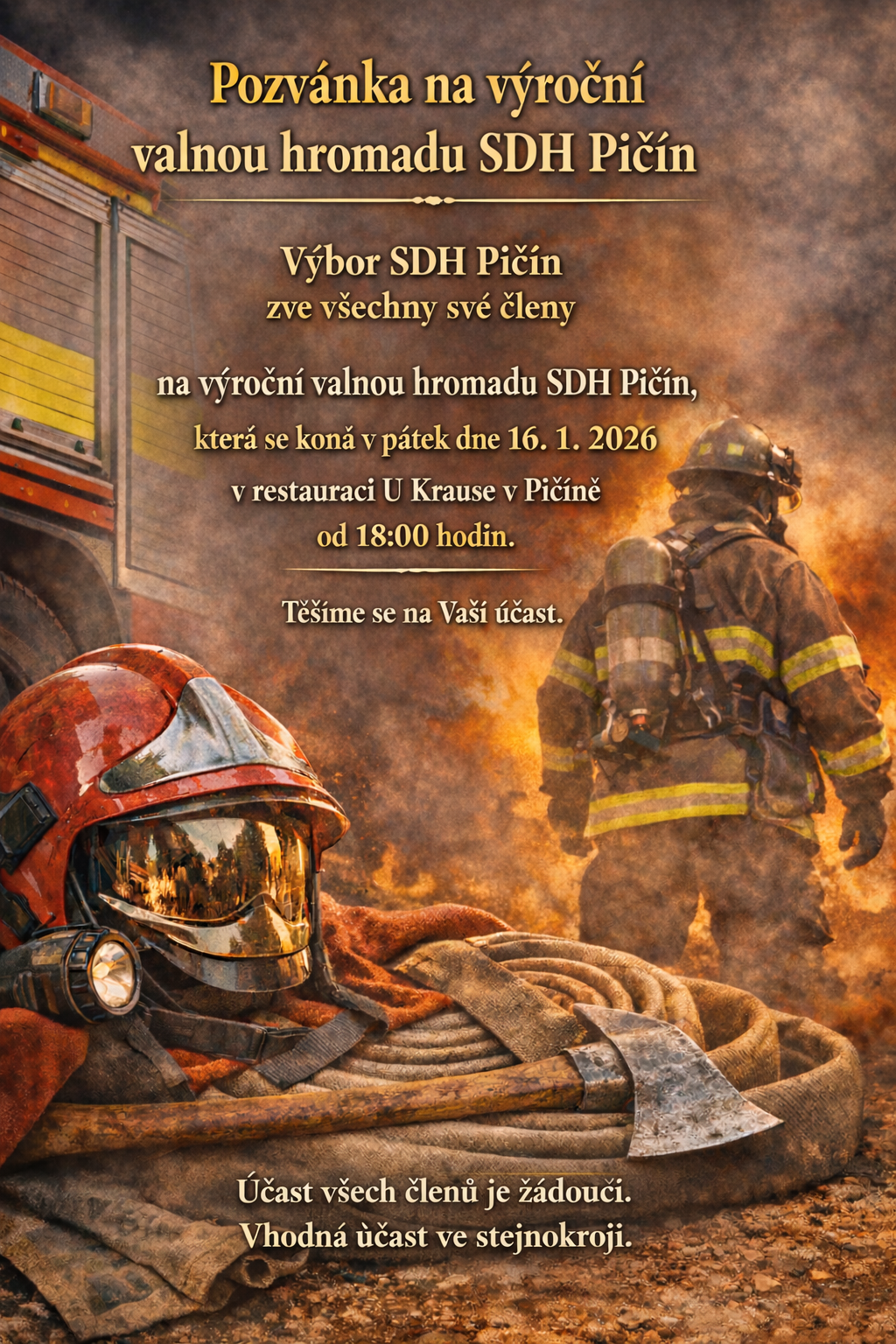 Výroční valná hromada SDH Pičín se koná v pátek 16.1.2026 od 18:00 v restauraci u Krause.